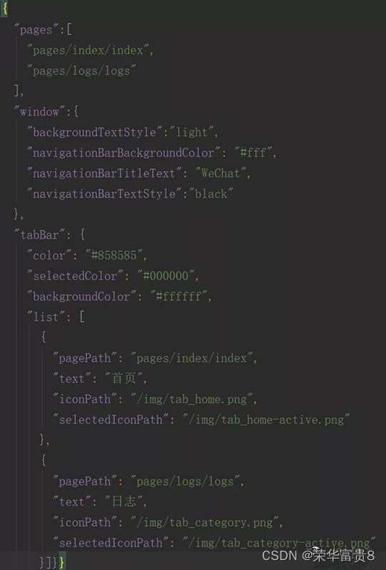 其中pages 就是路由的相关配置; window为小程序窗口风格相关的配置;tabBar为底部导航栏的配置。