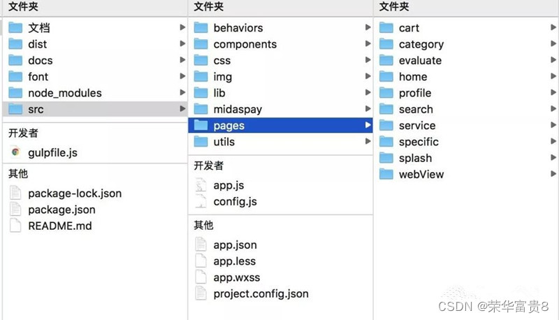 1. 用小程序开发的同学应该知道,小程序没办法引入node包,只能在小程序IDE工具上开发,假如我们有如下的场景,比如我们的样式是用less写的,比如我们对代码有一套自己的规范需要检测,甚至我们用的是vue代码来写小程序,等等这样的场景,如何实现呢,先上一个代码目录结构图:
