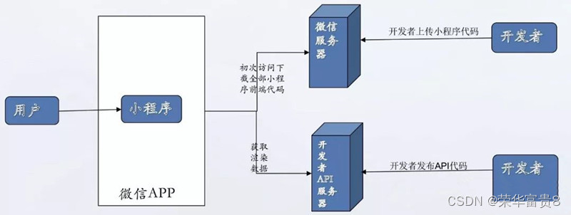 总结:小程序前端代码是统一上传到微信服务器,用户访问小程序时,微信客户端自动会去拉取小程序前端所有代码,小程序代码里再调用API从服务器取回数据,并把数据渲染到页面,然后展示给用户。