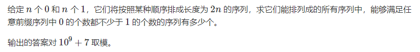 问题 :n个0和n个1,它们将按照某种顺序排成长度为2n的序列,求它们能排列成的所有序列中,能够满足任意前缀序列中0的个数都不少于1的个数的序列有多少个。