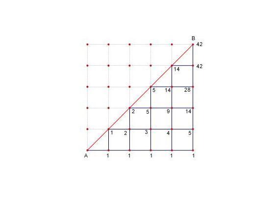 不合法方案必然经过y=x+1,取第一个经过y=x+1的点,令后面的线段对y=x+1做轴对称,终点为(n+1,n-1).任意一条从(0,0)到(n+1,n-1)的路径都对应一条不合法方案。即
