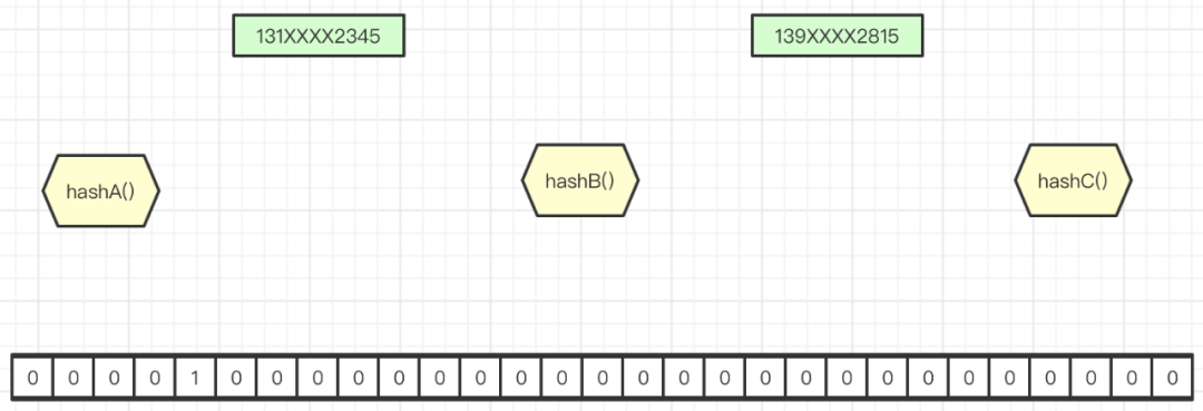 实现原理就是我们需要一个很长的二进制数组(也叫向量);在添加数据时,使用多个hash函数对key进行hash运算得到一个索引值(即二进制数组的索引值)
