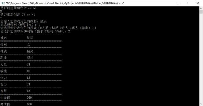 本题目要求首先用户输入角色姓名,然后由用户选择角色性别,然后由用户选择种族,然后选择职业,然后自动分配力量、敏捷、体力、智力和智慧属性,并计算生命值和魔法值。