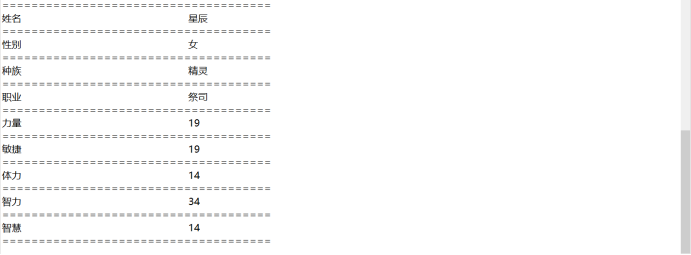 在用户重新创建角色过程中,输入角色姓名提示可以显现,但直接跳到输入角色性别,无法成功输入姓名,通过对while语句中的if条件语句进行修改,问题出在变量是用char定义的,但却提示输入大于一个字符,导致多余一个的字符作为姓名输出了,通过改正,运行成功;