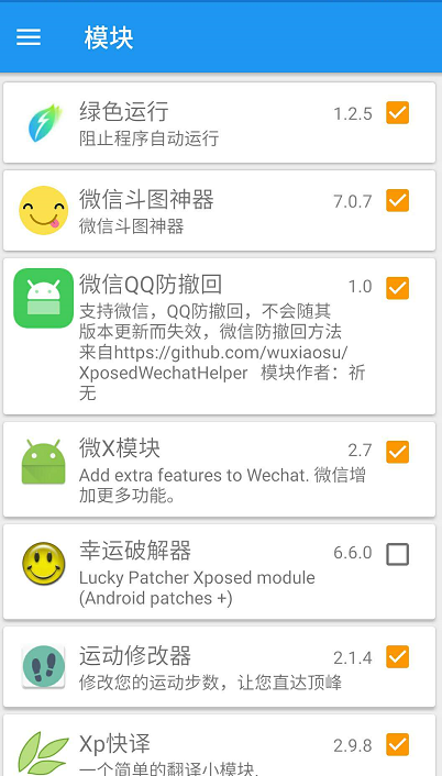 6. 接下来就是安装模块,这些也都是apk后缀的,本身就是APP所以也和一般应用一样的安装方法。然后打开Xposed Installer点击菜单按钮找到“模块”。