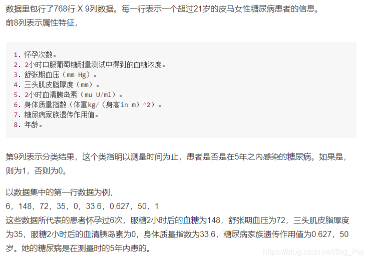 本文中的数据集使用的是“皮马印第安人糖尿病数据集”。该数据集由美国国立糖尿病、消化和肾脏疾病研究所(United States National Institute of Diabetes and Digestive and Kidney Diseases,简称NIDDK)提供。这里的“皮马”指的是位于美国亚利桑那州南部的一个县。