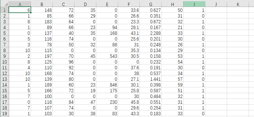 该数据集可从 https://raw.githubusercontent.com/jbrownlee/Datasets/master/pima-indians-diabetes.data.csv 下载,具体方法是打开此链接后,会看到数据展现在网页中,右击save as,保存类型选为“Microsoft Excel Comman Separated Values File“,即CSV格式,文件名按默认为pima-indians-diabetes.data.csv。