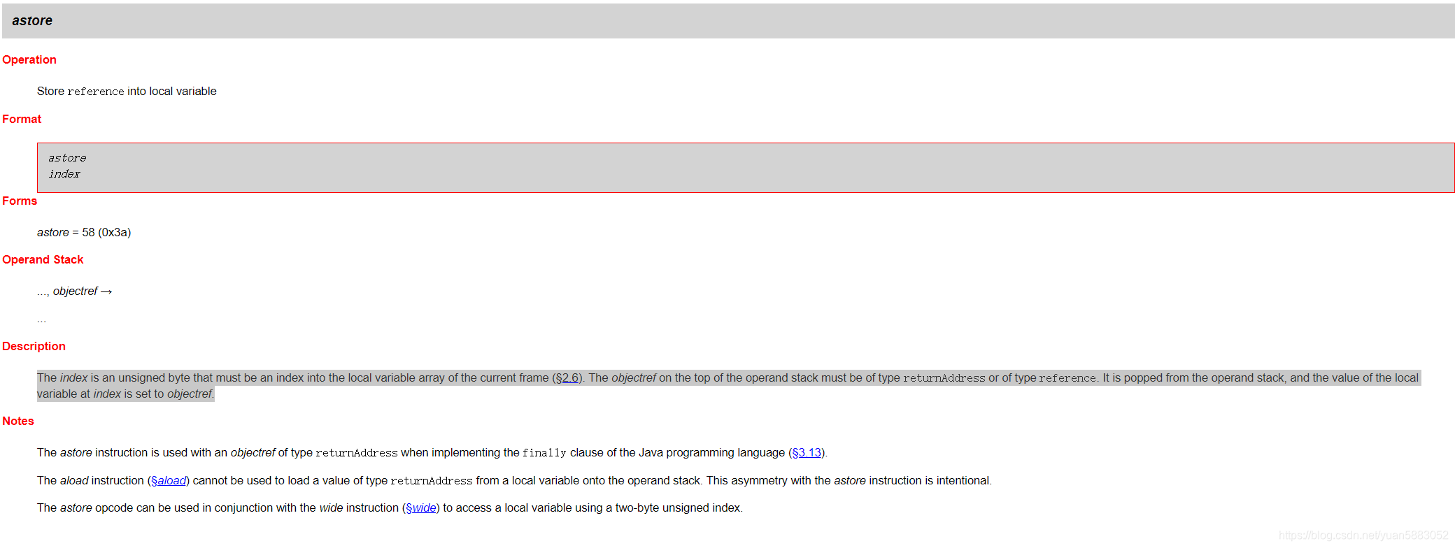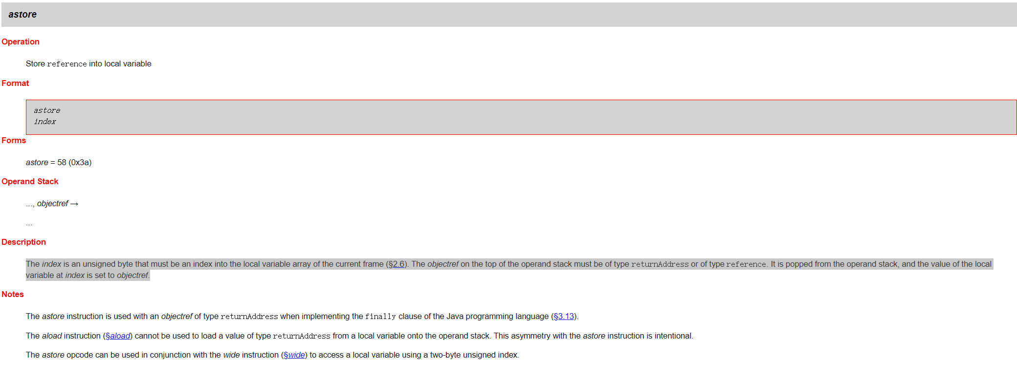 - astore指令操作的是栈顶的returnAddress类型或reference类型的数据