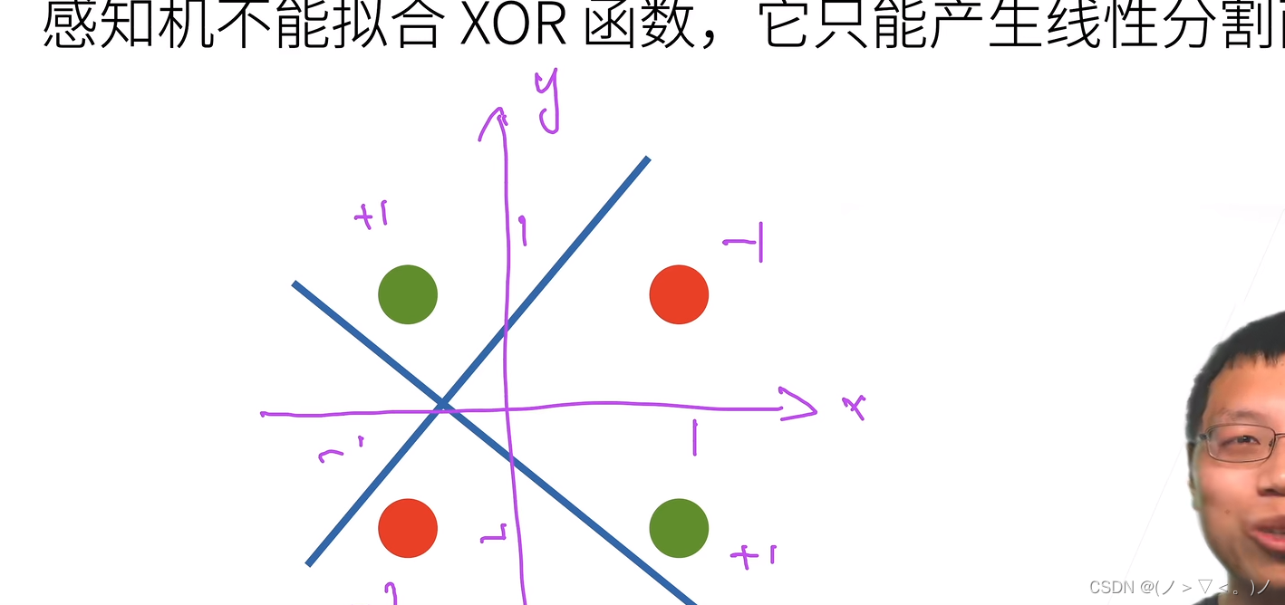 单层的感知机不能拟合X0R函数,因为模型是线性的,只能参生一个根线去切割面