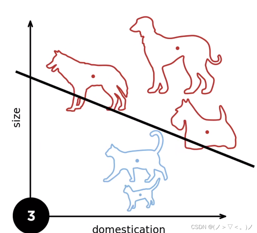 我们在识别猫狗的时候有权重,就像是下面那根界限(权重)一样区分了猫狗。下一次识别新的猫狗的时候我们发现我们之前的界限摆歪了,这样的话我们就会重新调整棍子(权重)的摆放,划分猫狗的界限,这样一次一次的调整完全部的样本,越调区分猫狗的界限越精确。