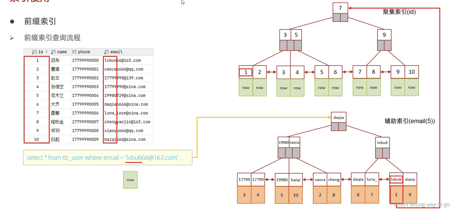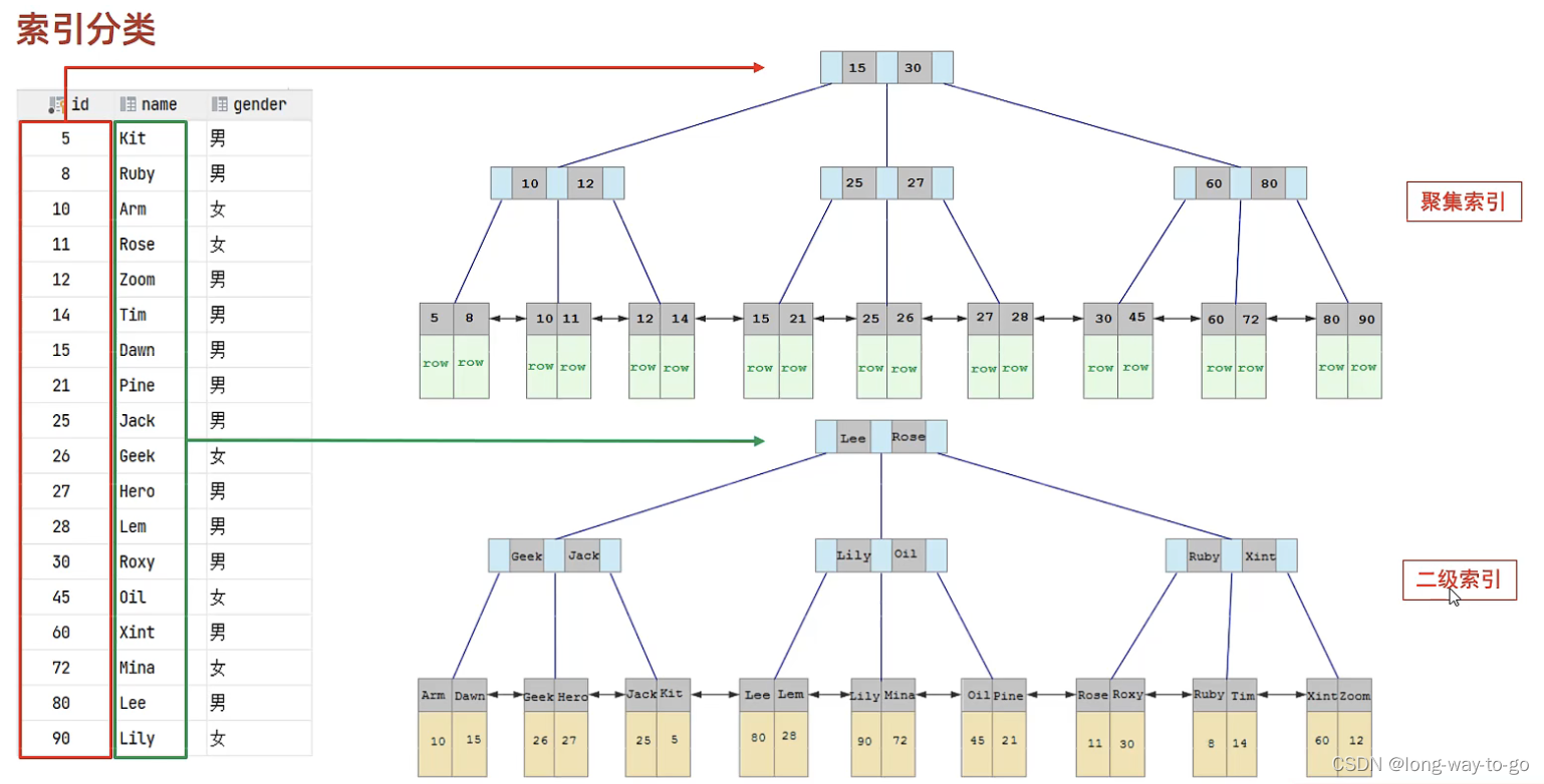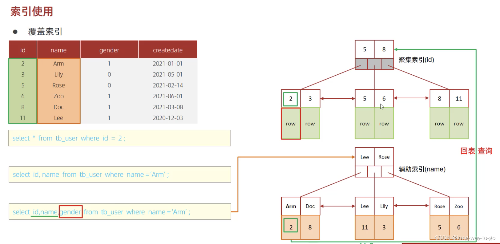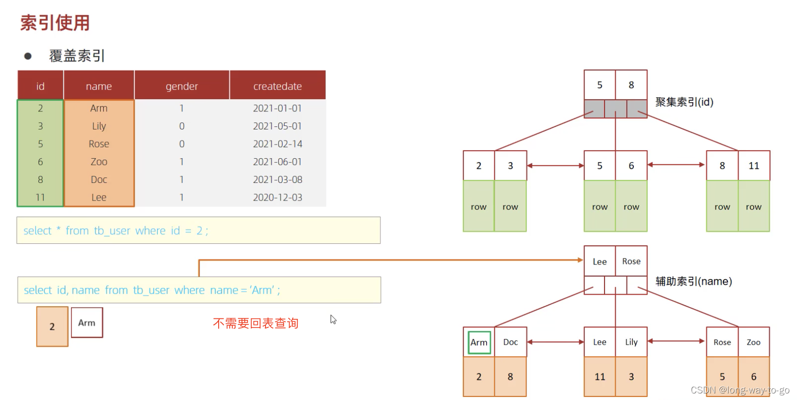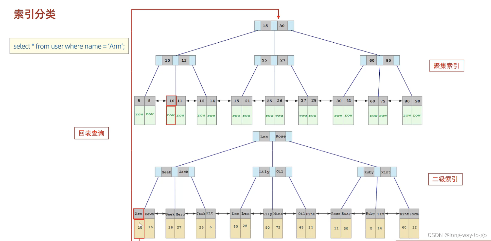 select * from user where name=‘Arm’ ,先会从二级索引查到Arm对应的主键是10,然后到聚集索引那里找到主键是10的,拿到其对应存储的row。