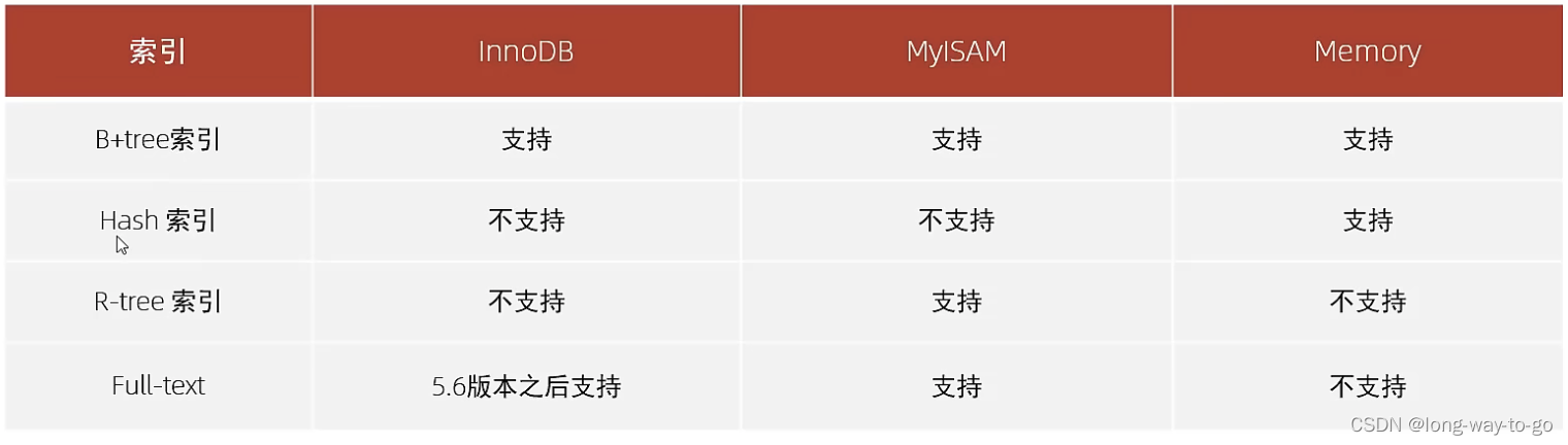 | R-tree(空间索引) | 空间索引是MyISAM引擎的一个特殊索引类型,主要用于地理空间数据类型,通常使用较少 |
