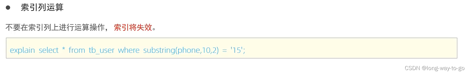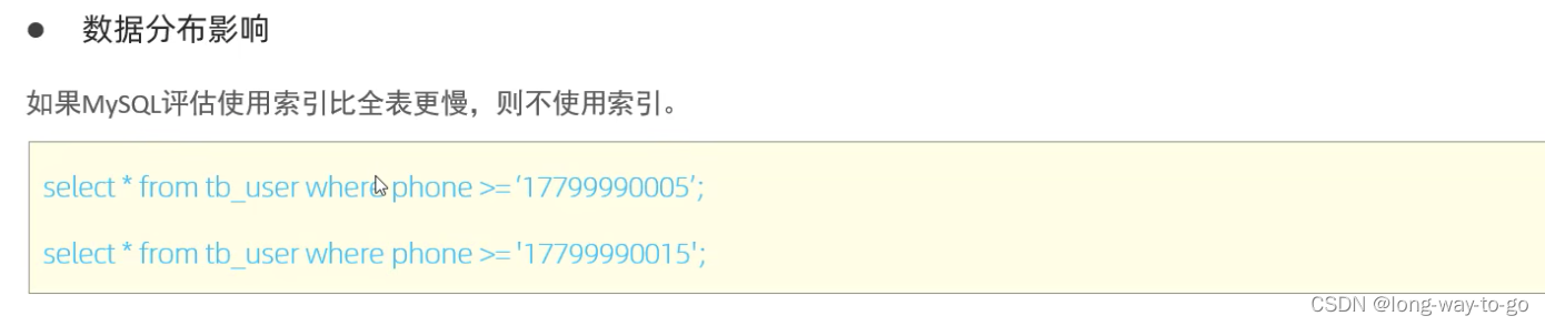 例子:表里有phone字段从17799990001----17799990020共20条,当查找phone>=17799990005时的数据有15条,则mysql认为大部分数据都满足条件,直接走全表扫描不走索引;当查找phone>=177999900015时的数据有5条,则只占总数的小部分,那么mysql就会觉得走索引快一点,这时索引就会生效。mysql会看过滤的数据占总数据的多少来评估是否走索引。