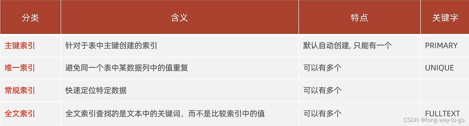 主键索引、唯一索引、常规索引、全文索引