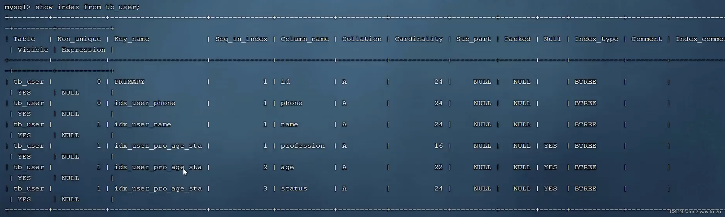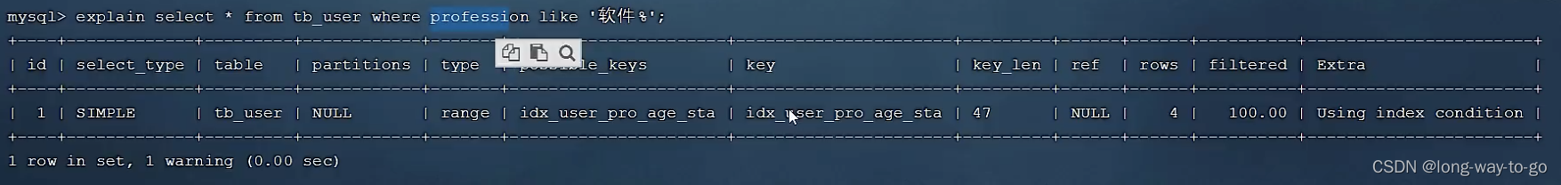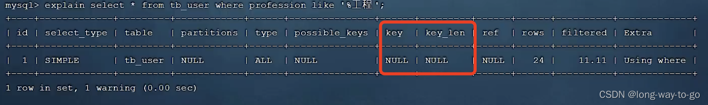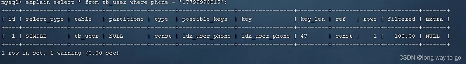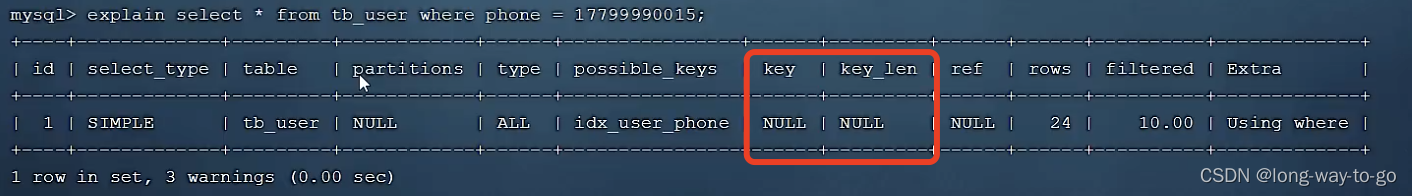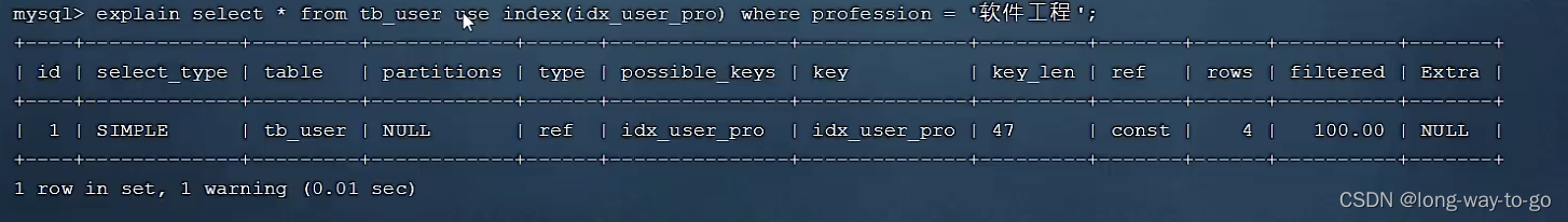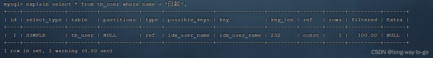 possible_keys可能用到的索引是idx_user_name, key实际用到的索引是idx_user_name。