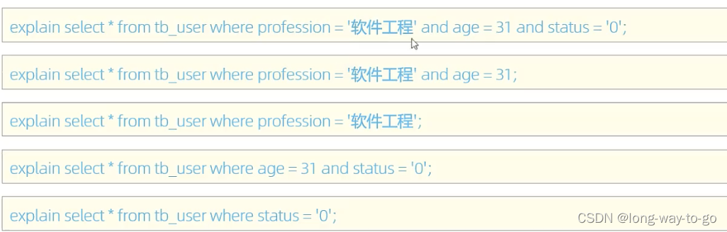 下图表中的联合索引professio、age、status,要遵守最左前缀法则,最左边的profession一定要存在,位置顺序不讲究。