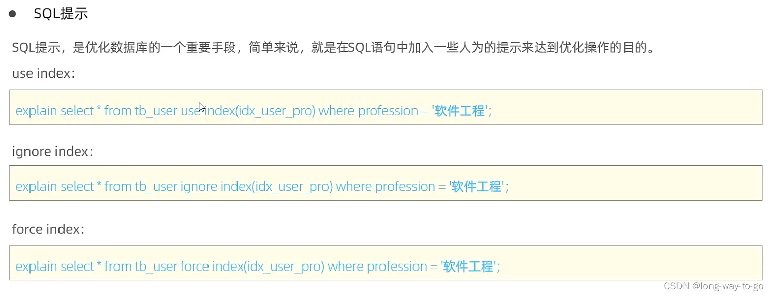 告诉mysql查询时建议用idx_user_pro这个索引查,接不接受看mysql,用force index就会强制要求mysql用指定索引。