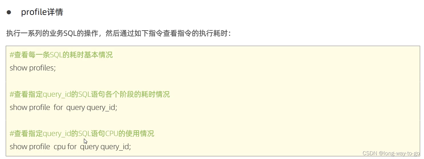 执行频次、慢查询日志、profile、explain