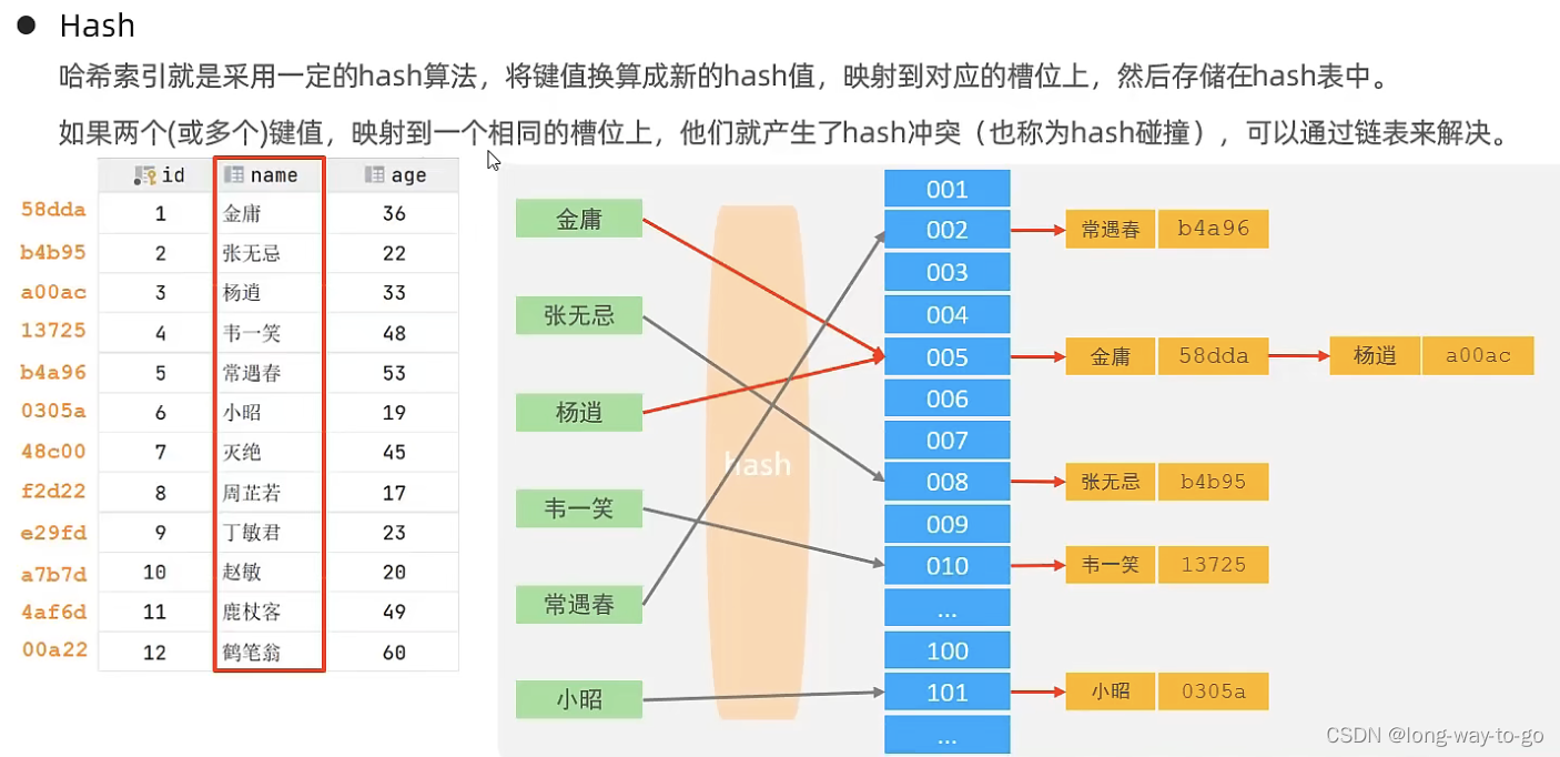 | Hash索引 | 底层数据结构是用哈希表实现的,只有精确匹配的索引列查询才有效,不支持范围查询 |