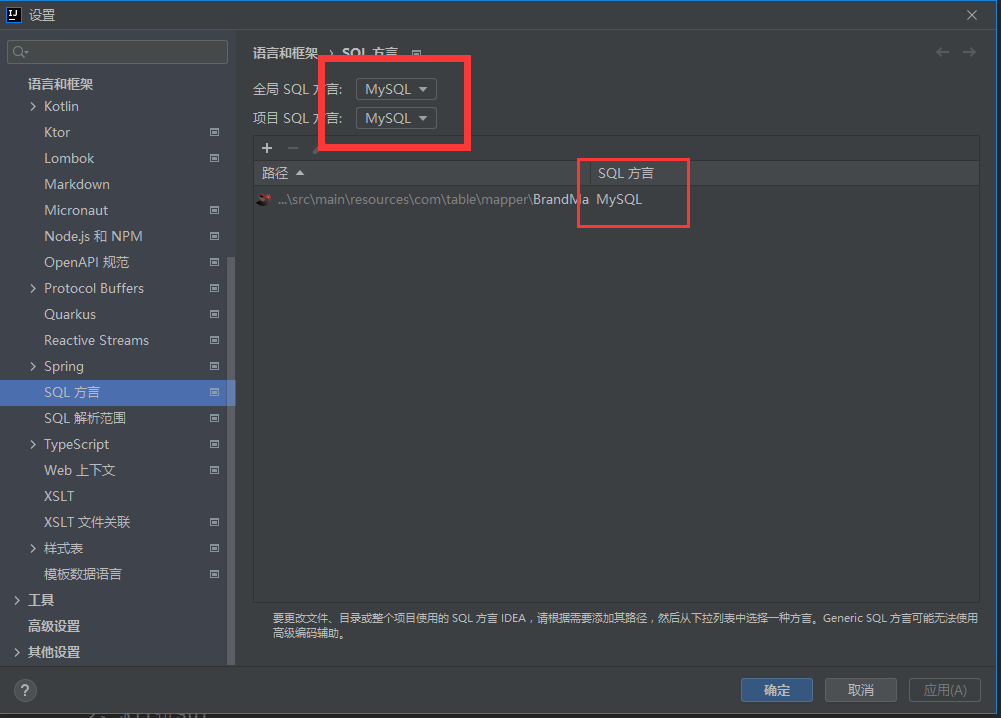 在IDEA中Mapper.xml不显示数据库提示在IDEA中Mapper.xml不显示数据库提示解决方法:File–>Settings–>Languages & FrameworksFile–>SQL Dialects 也可以直接搜索SQL Dialects,注意在路径那里 的SQL方言也需要改成MySQL 版权声明:本文为weixin_42147181原创文章,遵循CC 4.0 BY-SA版权协议,转载请附上原文出处链接和本声明。原文链接:https://blog.csdn.net/weixin_42147181/article/details/123555945