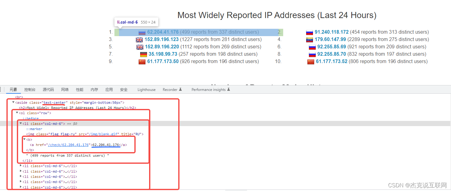 关于开源情报页面,我们在使用 Jsoup 方式的时候进行了简单的分析,这里我们就不在重复分析了。对于使用正则表达式方式提取,我们需要找到能够代表ip列表的结构体,比如: