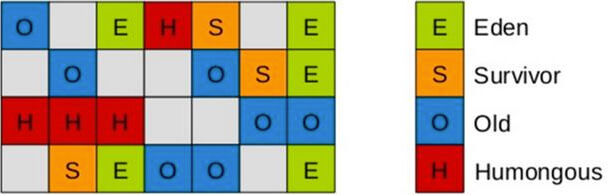 - 新对象产生于 Eden 区,回收时将 Eden 区存活对象复制到 Survivor 区,随即该区块成为空白内存区域,其他区块类似。