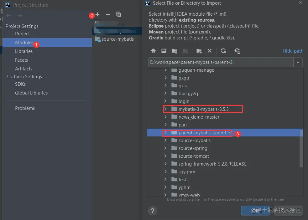 source-mybatis); ctrl+shift+ alt+ s打开项目配置,将两个项目添加进module中,至此源码导入结束。