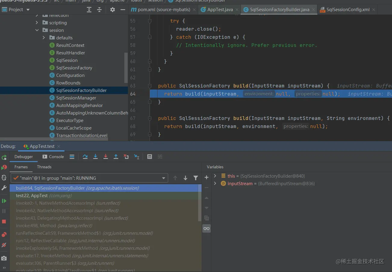 接下来我们debug执行测试方法,在第四行处打断点是可以在IDEA面板中跳转到我们的mybatis源码的类文件中的,接下来我们就可以自己写注释,来学习mybatis3的底层源码。