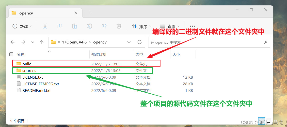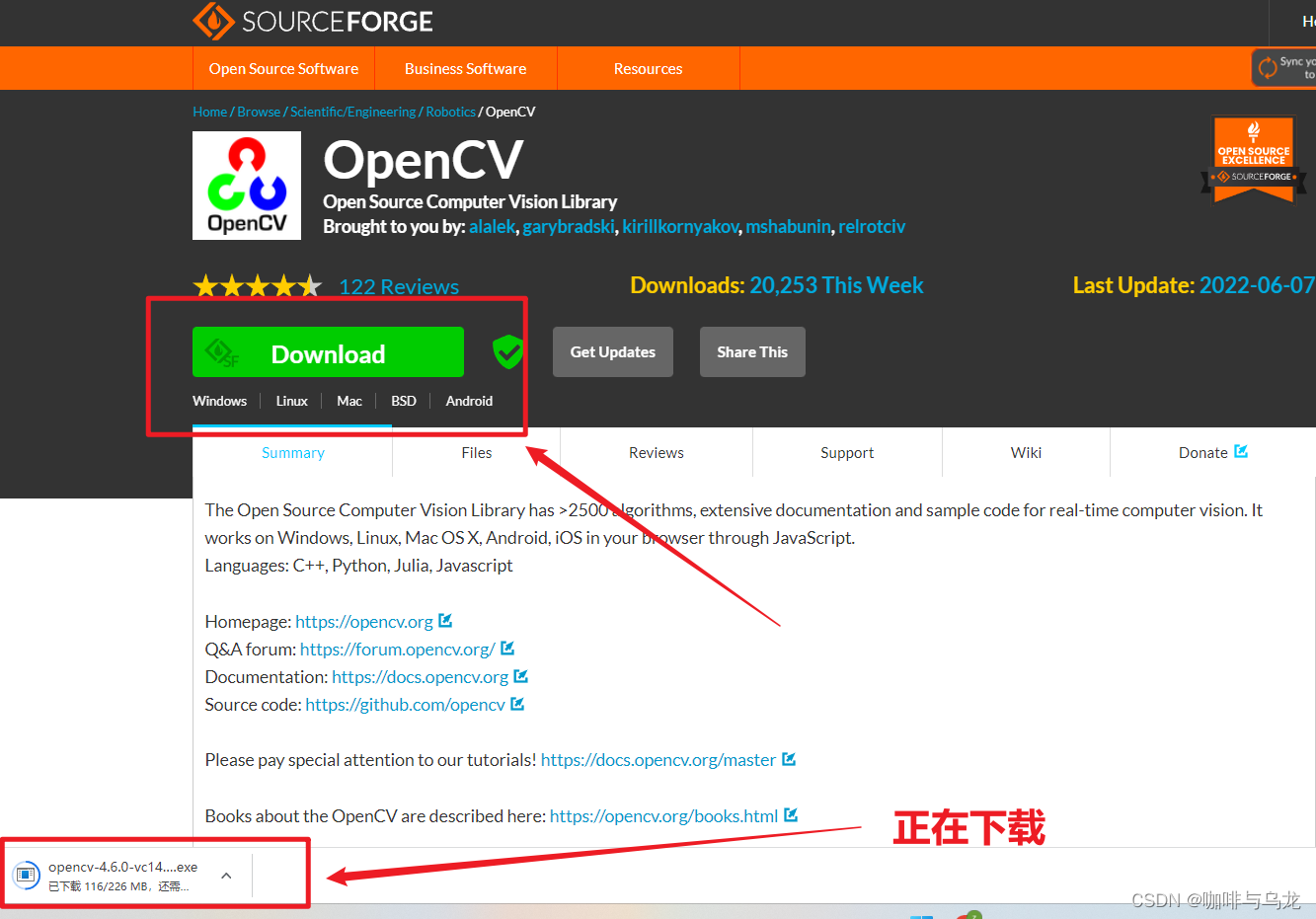 第一步, 去官网下载相应版本的OpneCV文件,本文以OpenCV–4.6.0 最近版为例。OpneCV官网:https://opencv.org/releases/