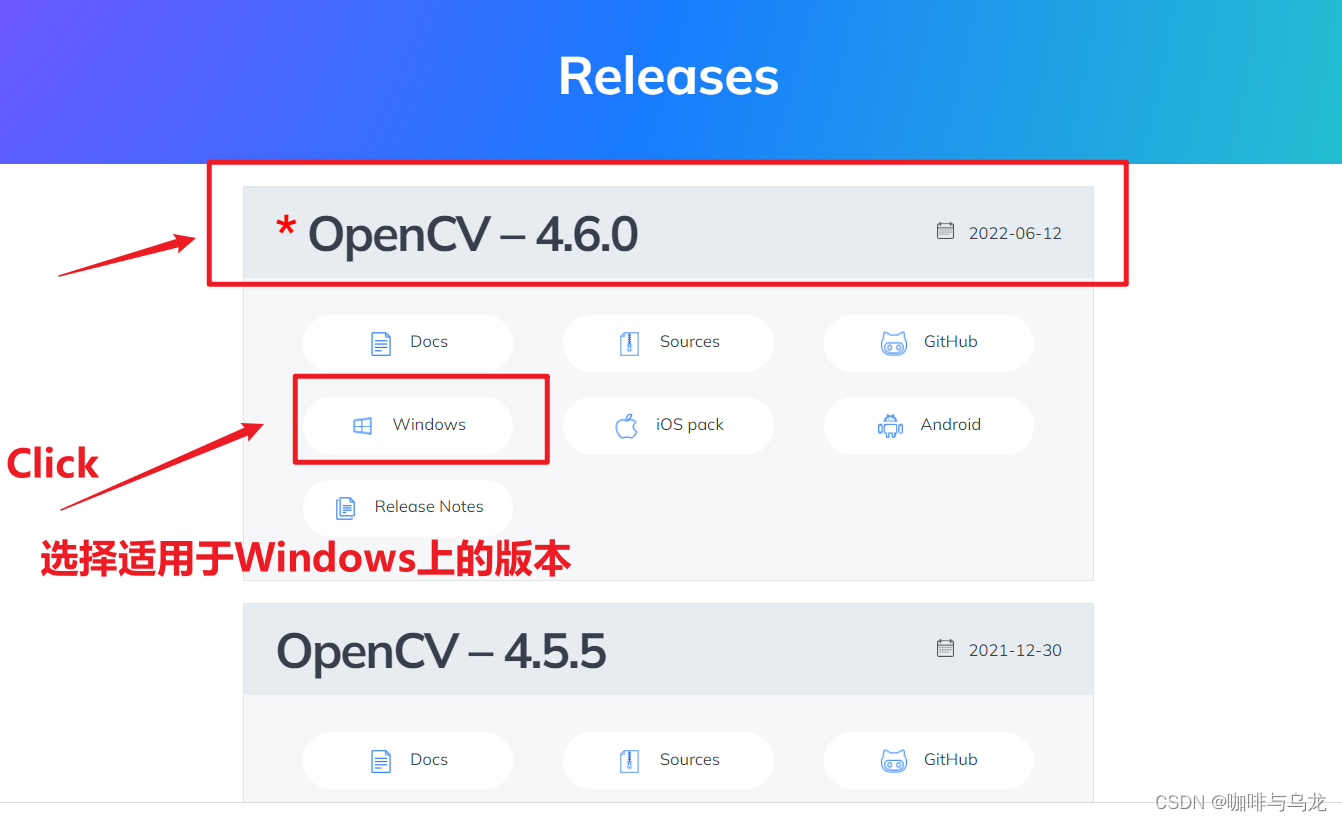 Click所指向的windows模块,选择适用于Windows的OpenCV版本