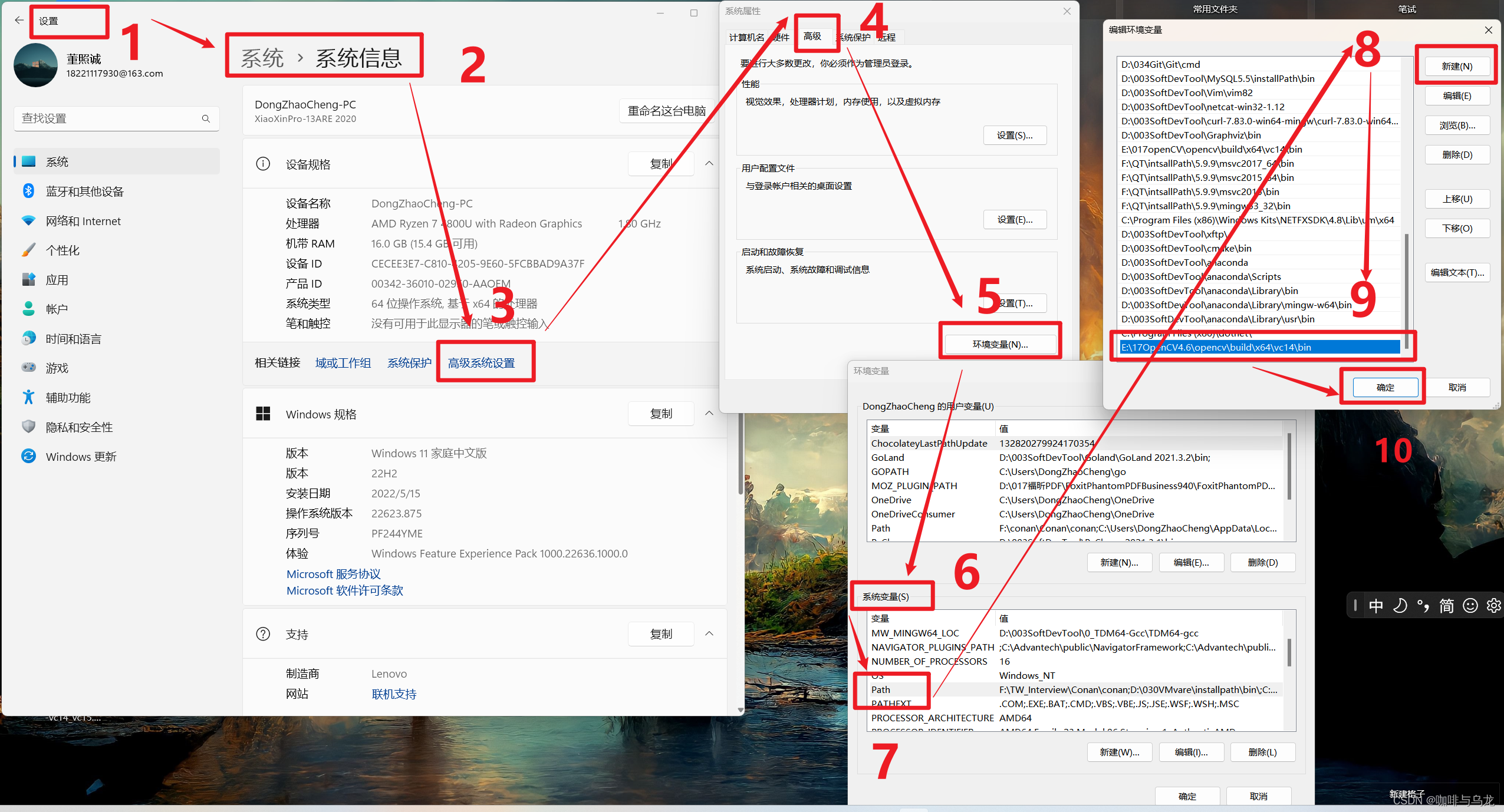②Win11中依次是 :设置–系统–系统信息–高级系统设置–高级–环境变量–系统变量–Path(双击)–新建—粘贴刚刚复制的路径–确定即可