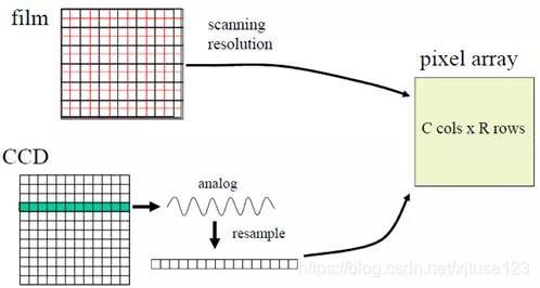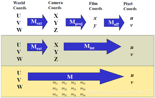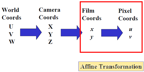 在上一节中,我们用矩阵描述了外部参数,即物体的坐标到相机坐标的变换。同时还分析了透视投影,即成像的过程,整个过程就是从(U,V,W)->(X,Y,X)->(x,y)。这一节主要讨论如何从像平面(物体坐标)(x,y)变换到数字图像(u,v),即从像平面(物体坐标)(Film Coords)到像素(Pixel Coords)。