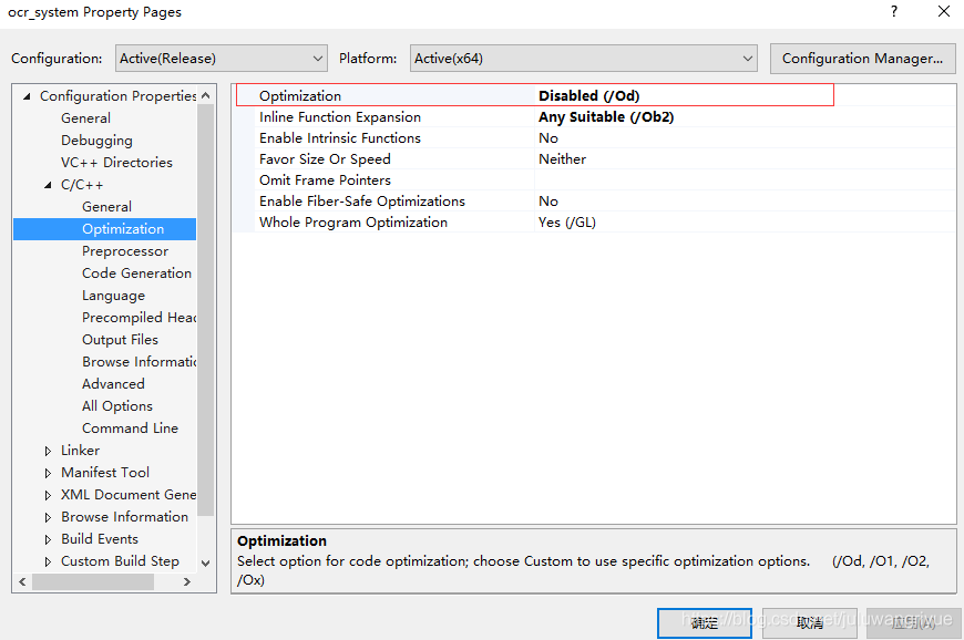 3. c/c++ ---- 优化 ---- 优化 配置 选 禁止(/Od)