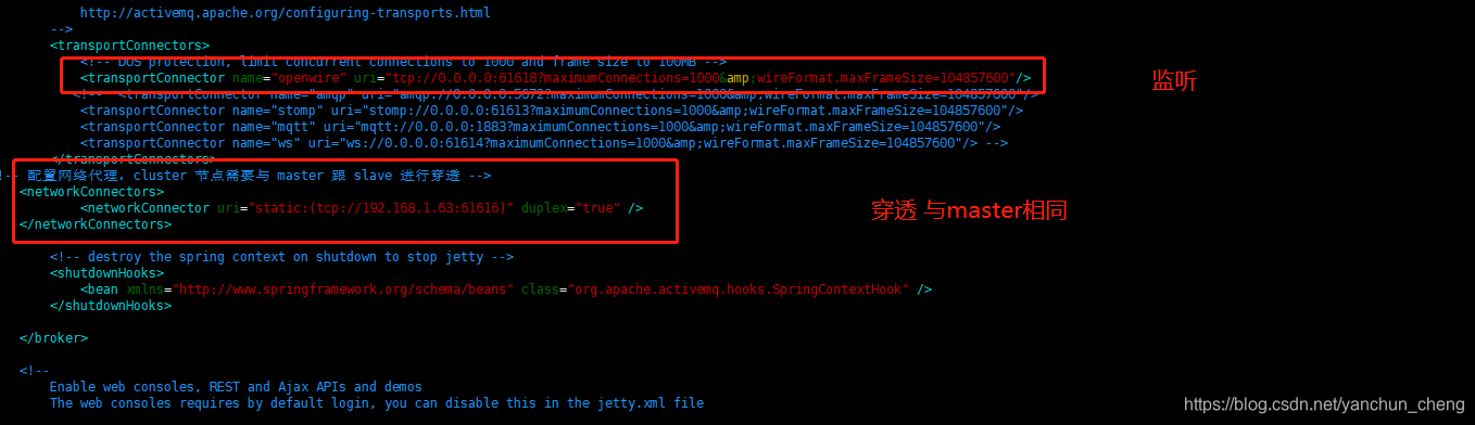 将配置文件增加两份,分别为activemq-master.xml和activemq-slave.xml