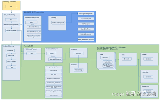- Planning主流程先是选择对应的Planner,此处用到工厂模式planner_factory_.CreateObject根据配置信息创建Planner(LatticePlanner、NaviPlanner、PublicRoadPlanner、RTKReplayPlanner),这里主要分析PublicRoadPlanner。在配置文件中定义了Planner支持的场景(Scenario),把规划分为具体的几个场景来执行,每个场景又分为几个阶段(Stage),每个阶段会执行多个任务(Task),任务执行完成后,对应的场景就完成了。不同场景间的切换是由一个状态机(ScenarioDispatch)来控制的。规划控制器根据ReferenceLineProvider提供的参考线,在不同的场景下做切换,生成一条车辆可以行驶的轨迹,并且不断重复上述过程直到到达目的地。