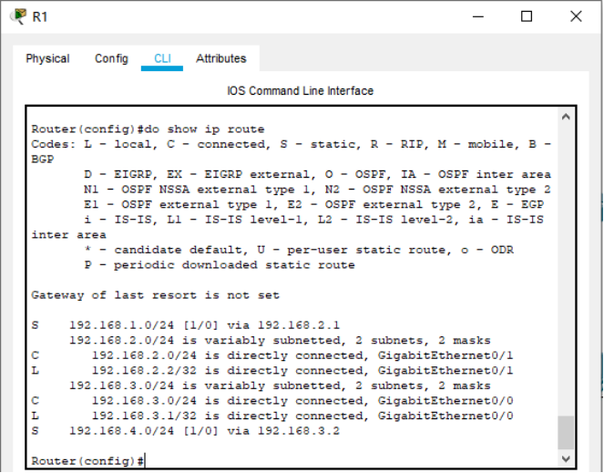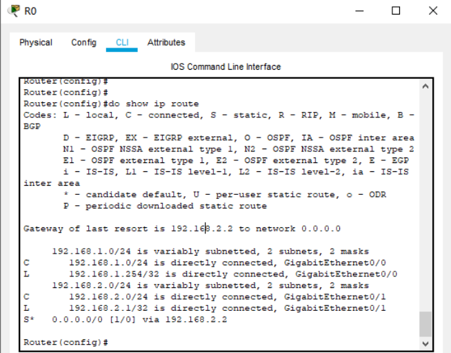 8.查看路由器的路由表,以 R0 为例,其中,以 S*开头的为默认路由。