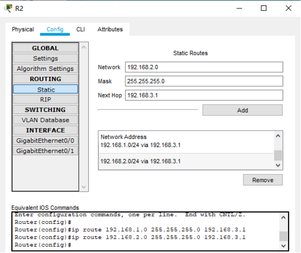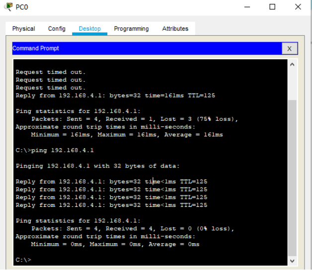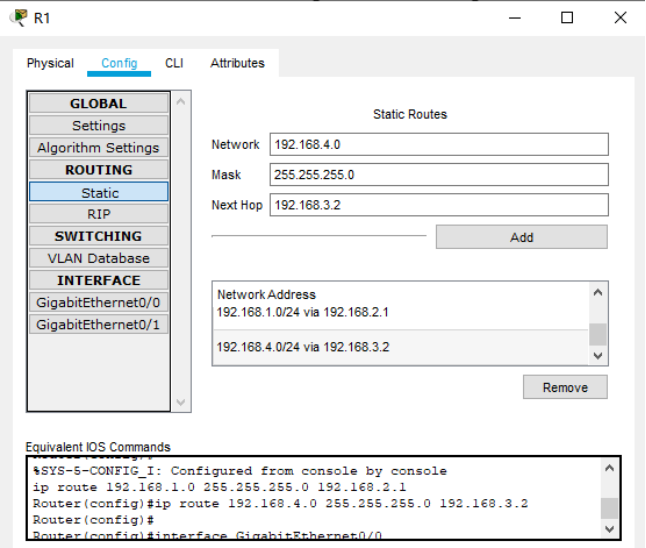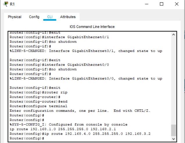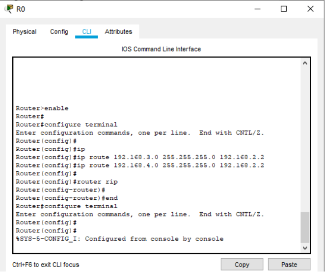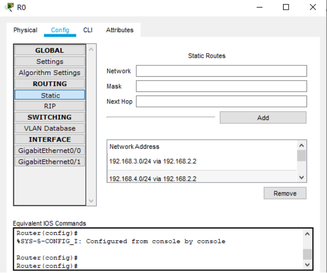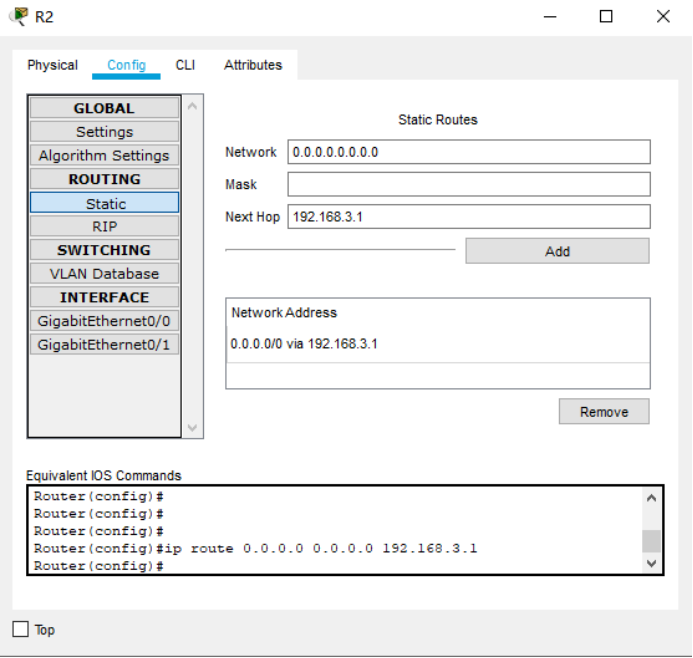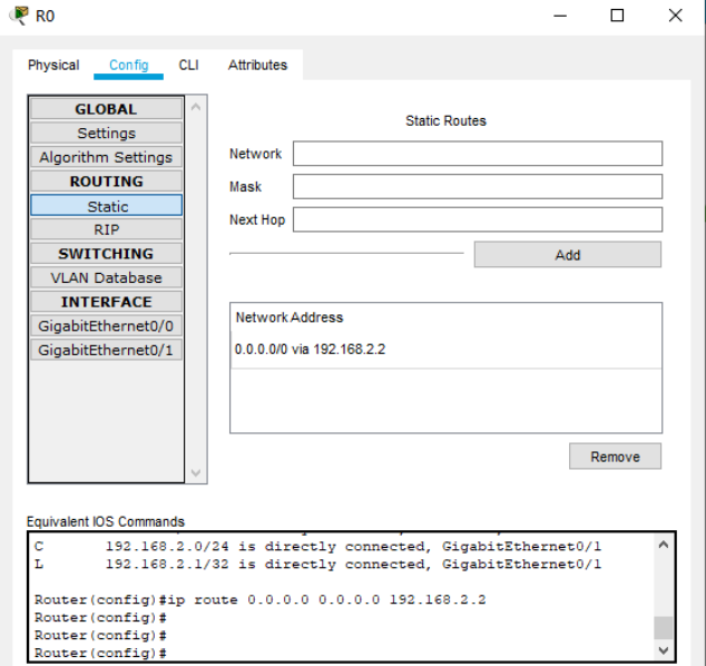 5.由PC0 ping PC1 结果显示连接超时,不能ping通。 6.对于路由器 R0 来说,其有两个直连网络,分别是 192.168.1.0/24 和 192.168.2.0/24,这两个网络不需要配置路由。通过前面的静态路由可知,R0 去 192.168.3.0/24 和 192.168.4.0/24这两个网络的下一跳都是 192.168.2.2,所以,这两个静态路由可以由一条指向 192.168.2.2 的默认路由代替。在前面配置的基础上,将静态路由删除(静态路由前面加 no),再增加一条默认路由即可。