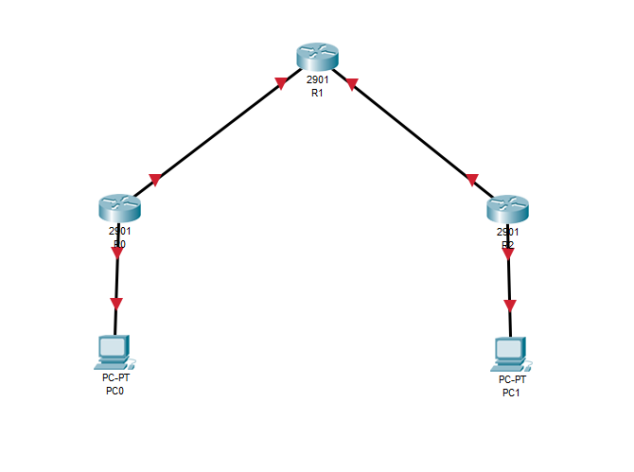 1、打开软件Cisco Packet Tracer 2、生成三台路由器,生成二台PC,布置拓扑 3、将每台PC与路由器进行连接。