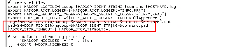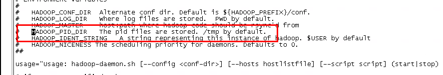 另外一个方法就是把HADOOP_PID_DIR设置为环境变量。考虑使用场景较小,没有必要写入系统环境变量。可以写入hadoop的环境变量hadoop-env.sh中,每次启动都会加载hadoop-env.sh。