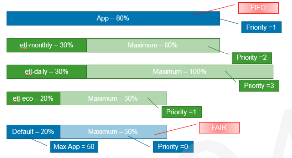 --> etl-monthly(占用整个集群30%的资源,最多可到80%,采用FIFO策略)