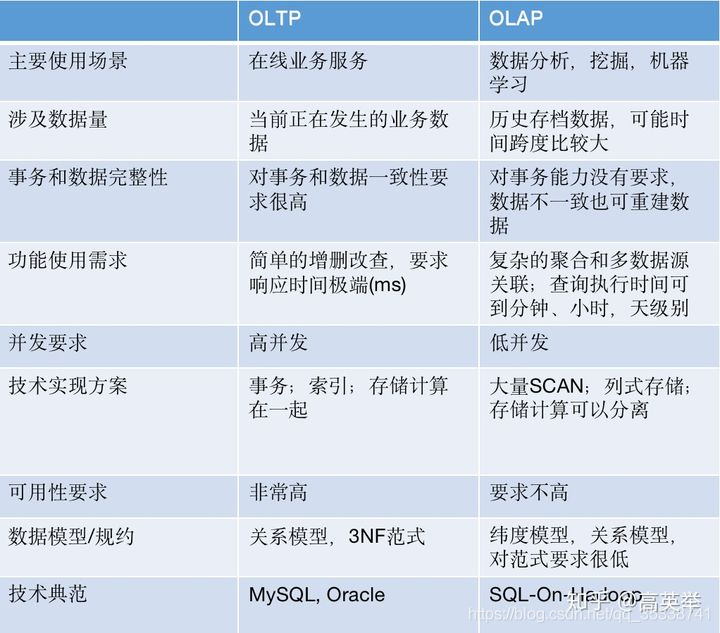 OLAP(On-line Analytical Processing,联机分析处理)是在基于数据仓库多维模型的基础上实现的面向分析的各类操作的集合。可以比较下其与传统的OLTP(On-line Transaction Processing,联机事务处理)的区别来看一下它的特点:(图片来自知乎网友)