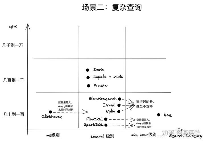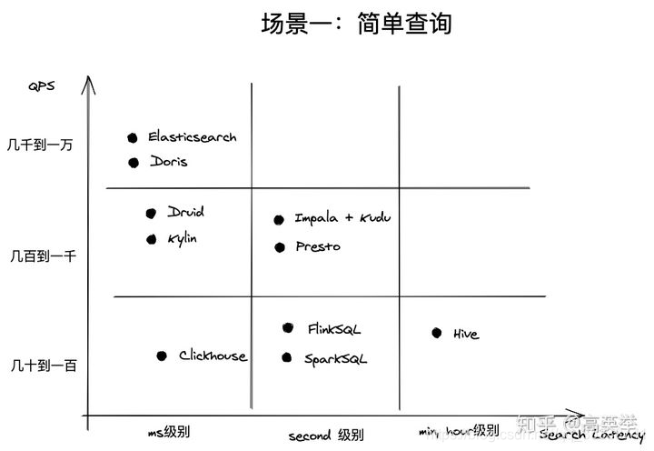 简单查询指的是点查、简单聚合查询或者数据查询能够命中索引或物化视图(物化视图指的是物化的查询中间结果,如预聚合数据)。这样的查询经常出现在【在线数据服务】的企业应用中,如阿里生意参谋、腾讯的广点通、京东的广告业务等,它们共同的特点是对外服务、面向B端商业客户(通常是几十万的级别);并发查询量(QPS)大;对响应时间要求高,一般是ms级别(可以想象一下,如果广告主查询页面投放数据,如果10s还没有结果,很伤害体验);查询模式相对固定且简单。从下图可知,这种场景最合适的是Elasticsearch、Doris、Druid、Kylin这些。