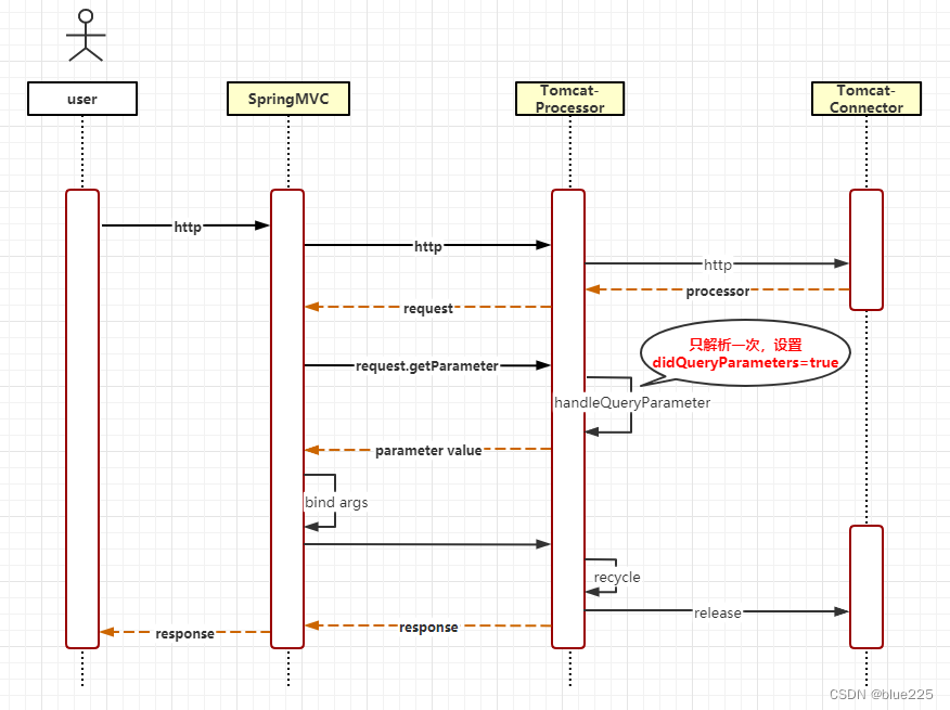 - 当tomcat再次通过connector1受理新的http请求时,由于request.didQueryParameters=true,这时新请求调用getParameter方法将不会再解析queryString,因而无法正确获取parameter参数值