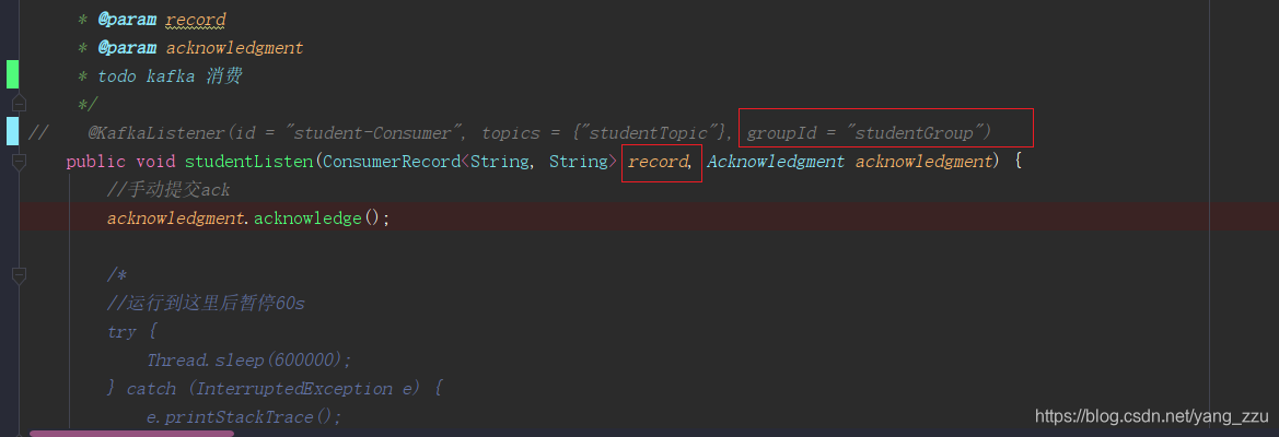 但是这里使用批量消费,然后手动提交的时候,使用的消费群组也是 studentGroup ,这就和之前的消费群组产生了冲突,导致偏移量提交失败。