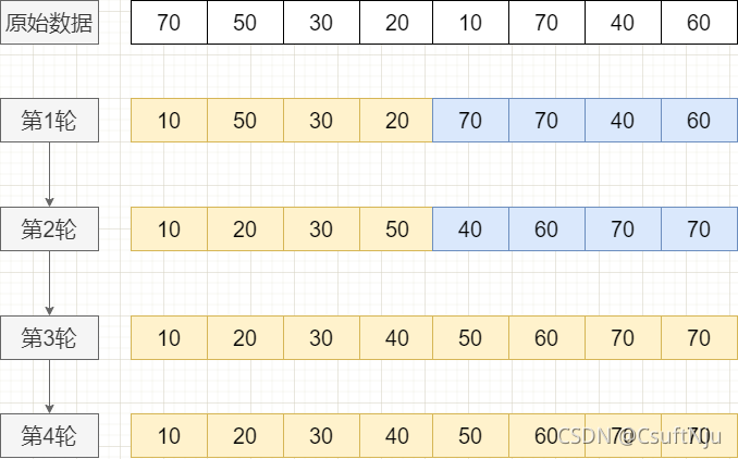 根据这个特性就可以把根节点拿出来,然后再用父节点和他的孩子节点进行比较,取最大的孩子节点和其进行交换,再把根节点拿出来,一直循环到最后一个节点,就排序好了。