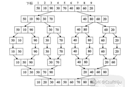 归并排序(Merging Sort)就是利用归并的思想实现的排序方法。原理是假设初始序列含有n个数,则可以看成是n个有序的子序列,每个子序列的长度为1,然后两两归并,得到[n/2] (不小于n/2的最小整数)个长度为2或1的有序子序列,再两两归并,如此重复,直至得到一个长度为n的有序序列为止,这种排序方法称为2路归并排序。