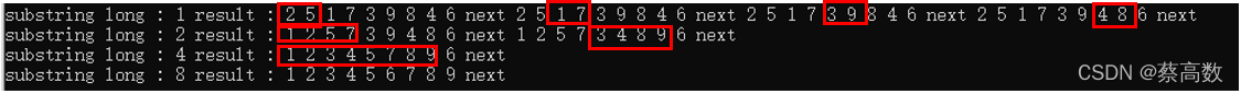 查看上面的程序输出,如下所示,依次对相邻两个子序列排序,子序列长度从1到8.每次排序的两个子序列为红框内的数。