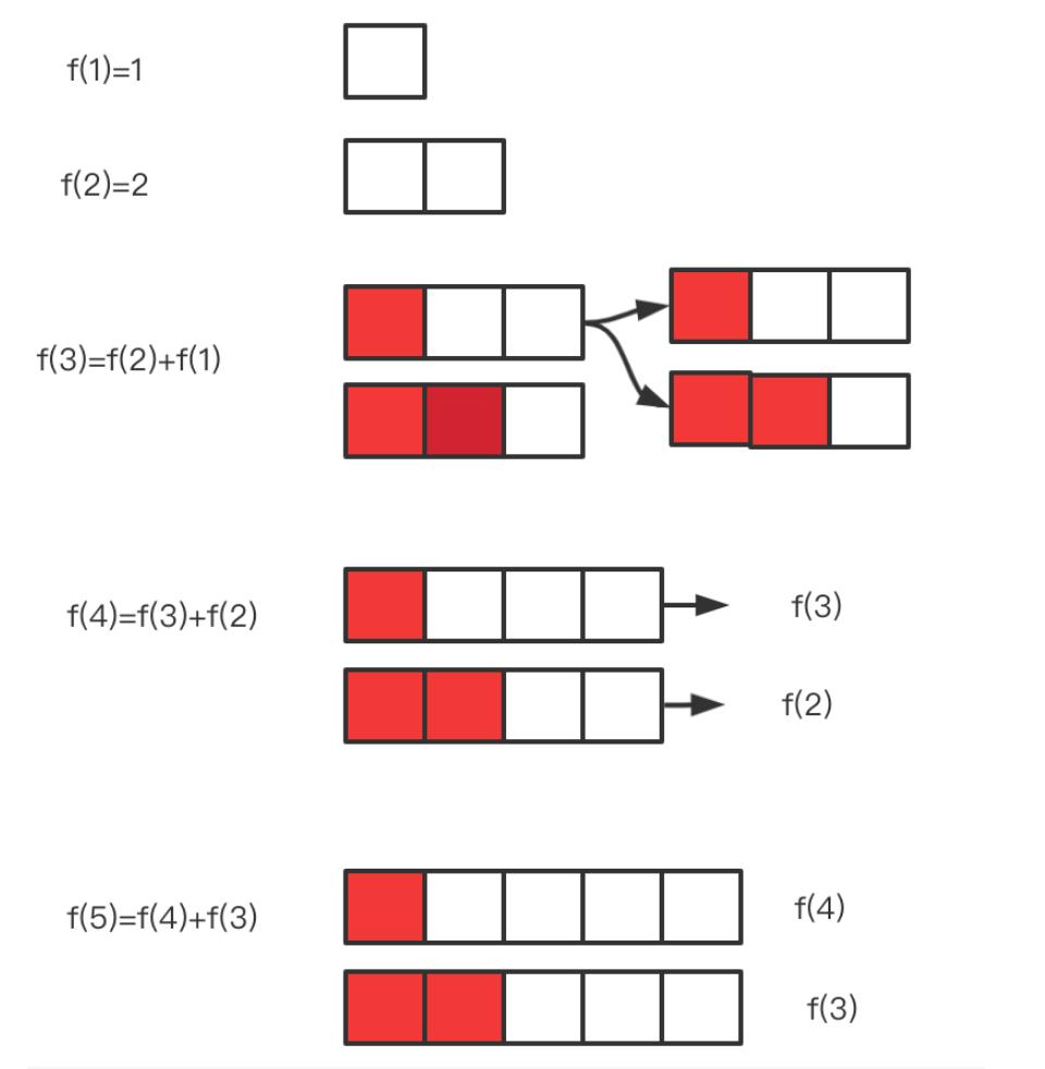 从这里我们可以归纳出,递推公式是f(n)=f(n-1)+f(n-2),然后就可以根据三步走策略来写代码了: