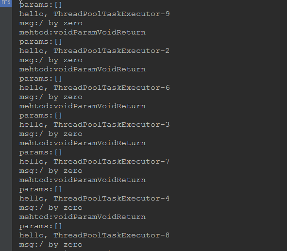 @Asyncpublic void voidParamVoidReturn() {System.out.println("hello, " + Thread.currentThread().getName());int i = 1 / 0;}