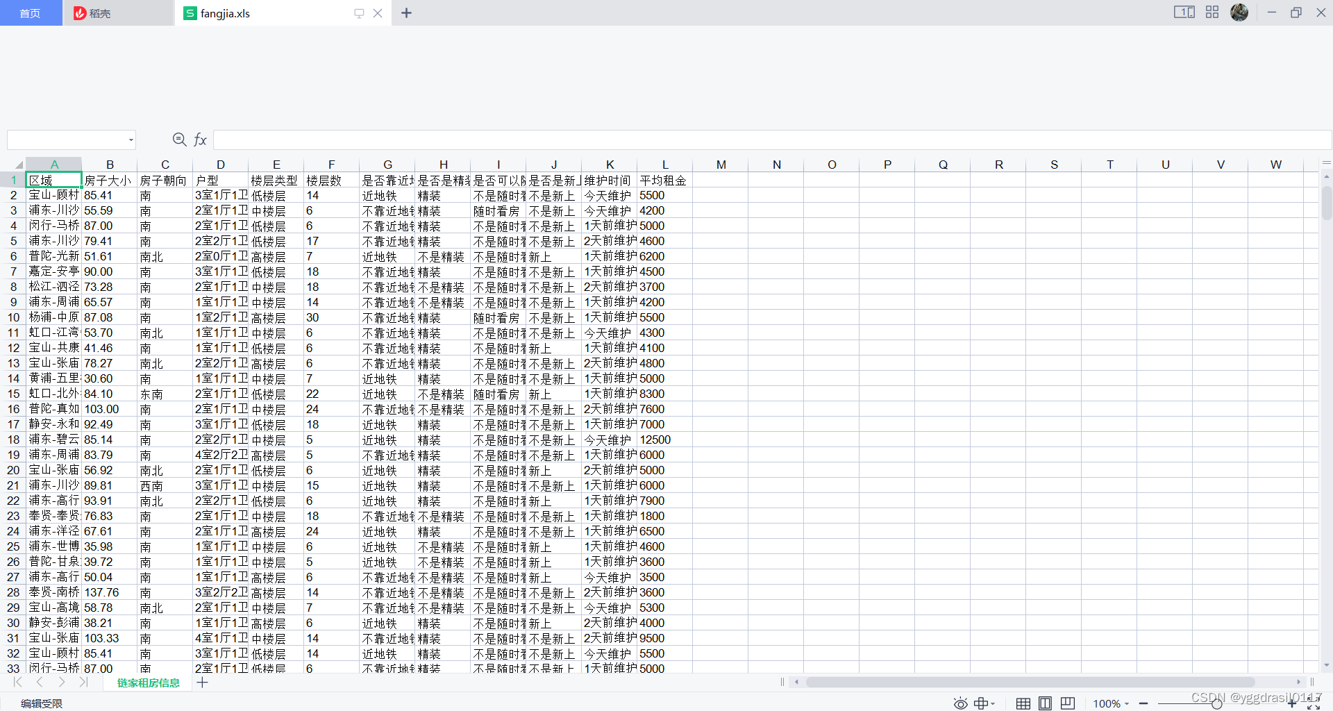 col = ("区域","房子大小","房子朝向","户型","楼层类型","楼层数","是否靠近地铁","是否是精装","是否可以随时看房","是否是新上的","维护时间","平均租金")